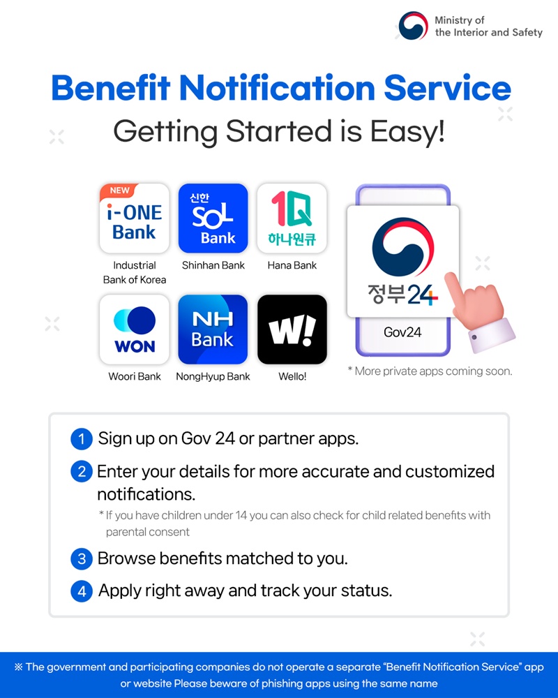 The government and participating companies do not operate a separate “Benefit Notification Service” app or website. Please beware of phishing apps using the same name.